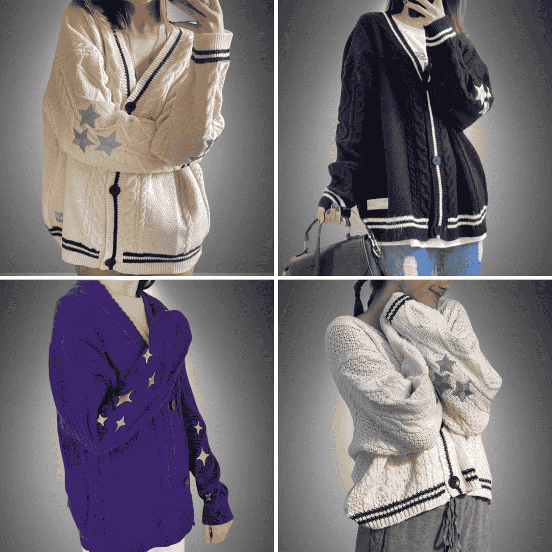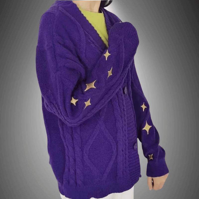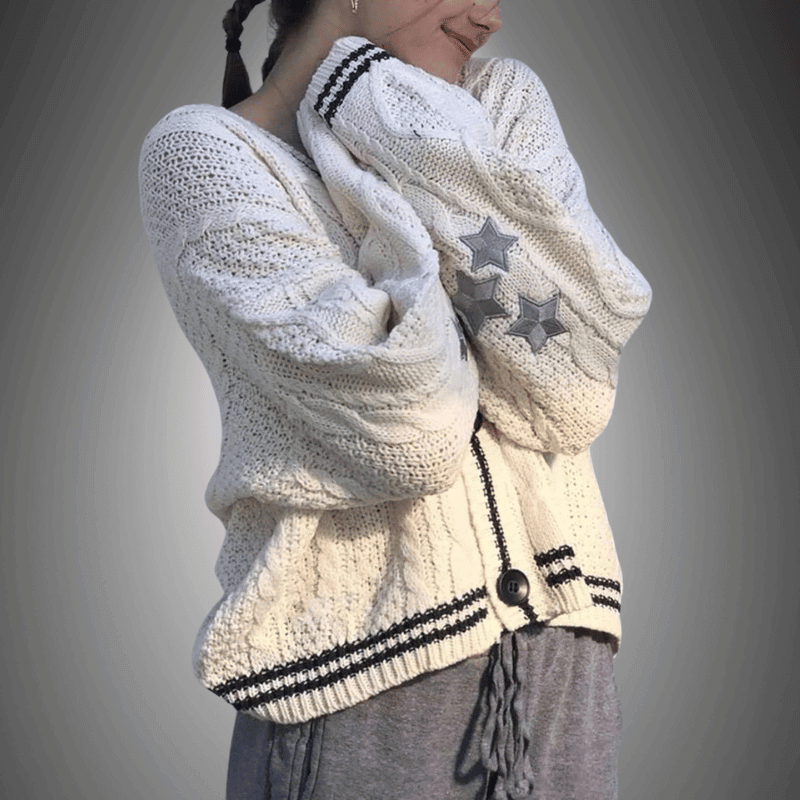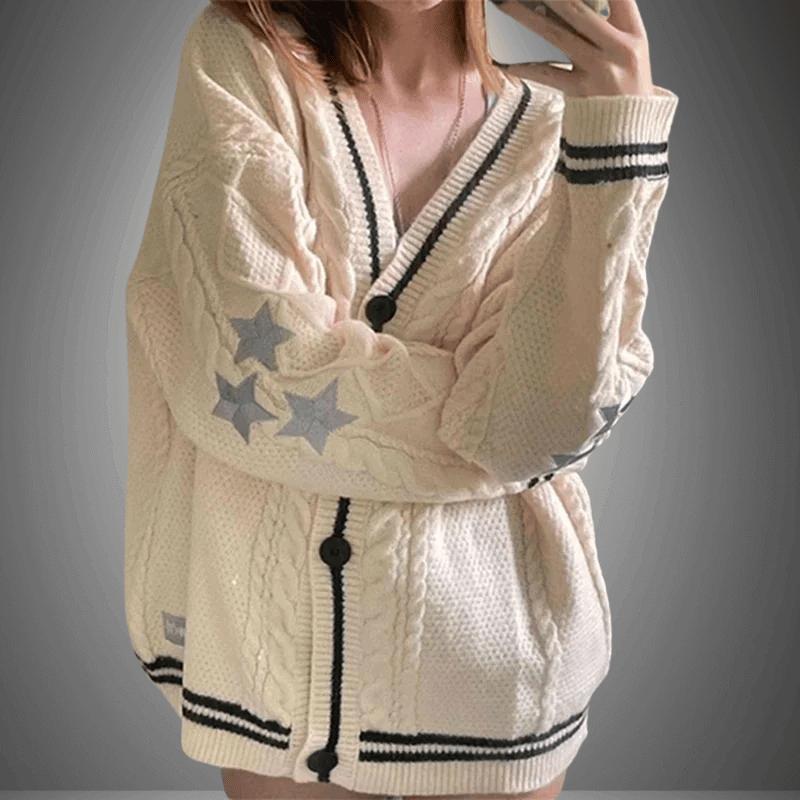 Wrap yourself in this buttery-soft, cable-knit cardigan, featuring playful star accents on the sleeves. Crafted with care for those who appreciate comfort with a dash of whimsy. This Luxe Star-Embellished Knit Cardigan is your go-to for cozy mornings or stylish outings.