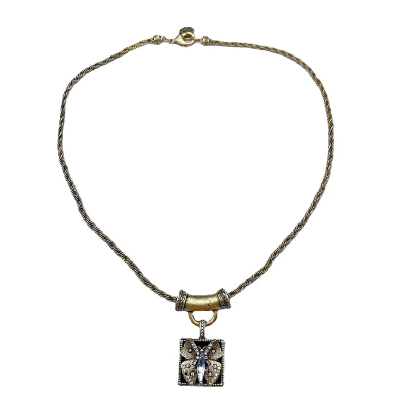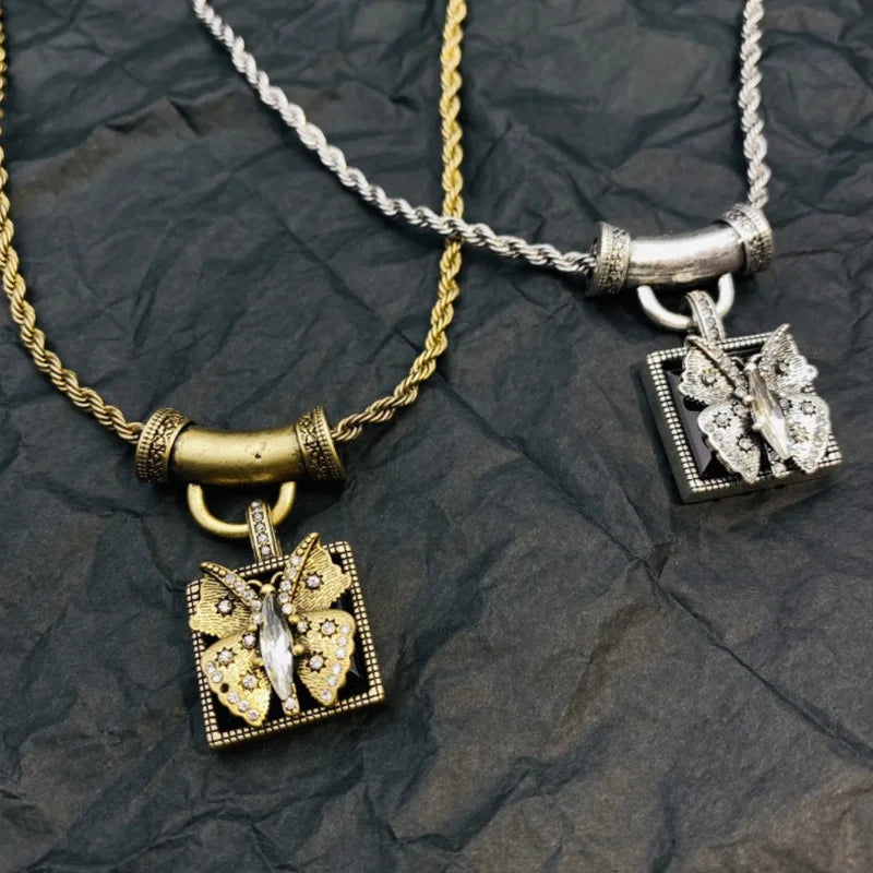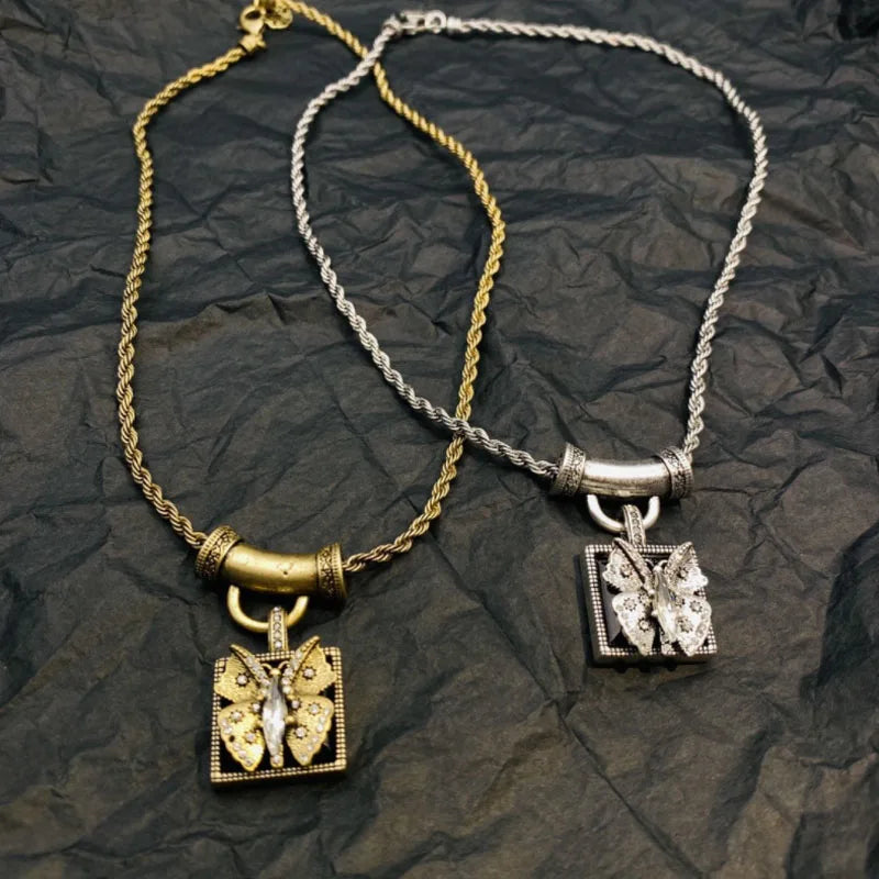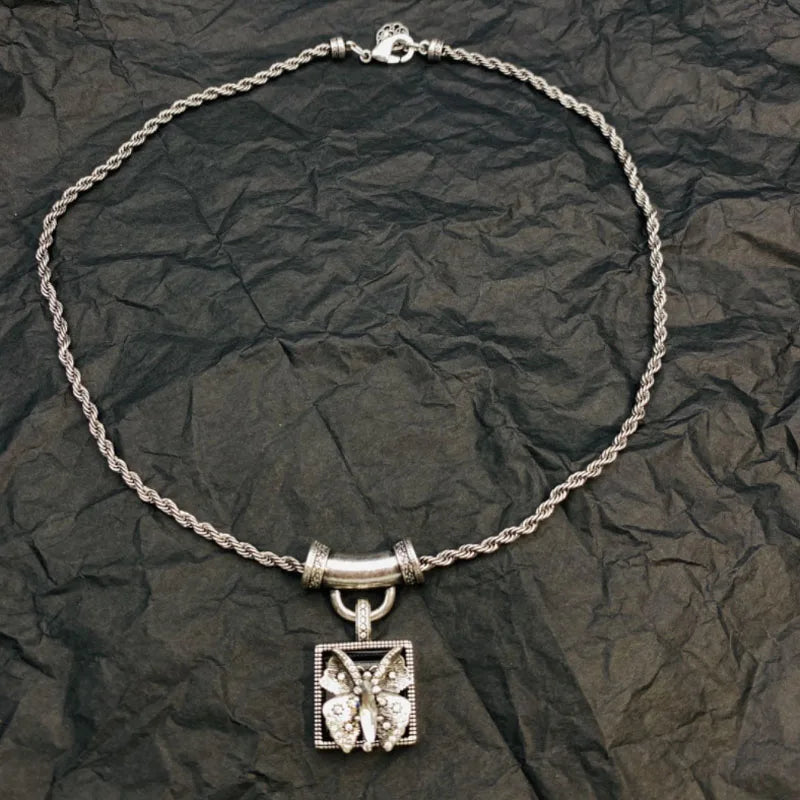 Feel the weight of history in every detail of this Butterfly Heirloom Necklace. The delicately crafted pendant, with its antique finish, catches the light with every move, while the sturdy twisted chain sits comfortably against the skin.